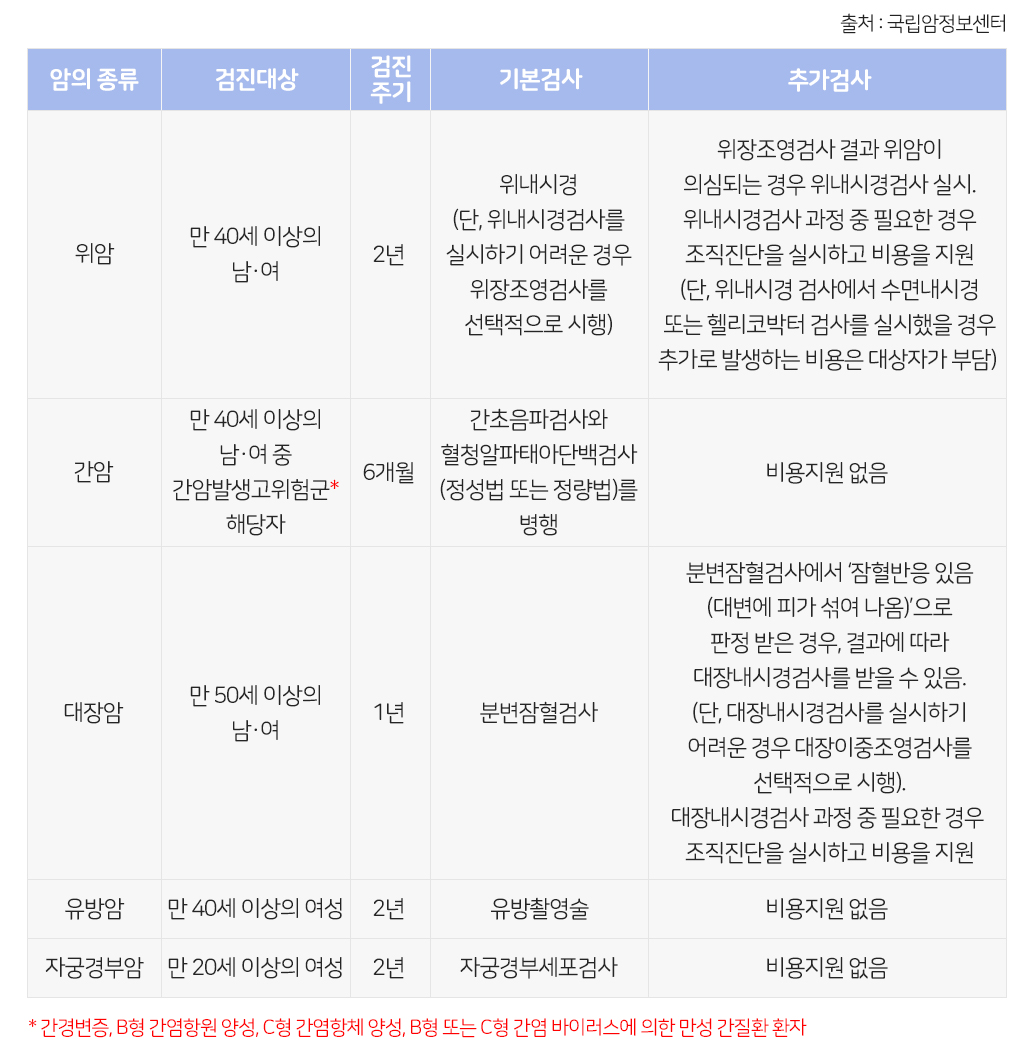 더 자세한 정보는 국가 암검진 프로그램에서 확인할 수 있다.