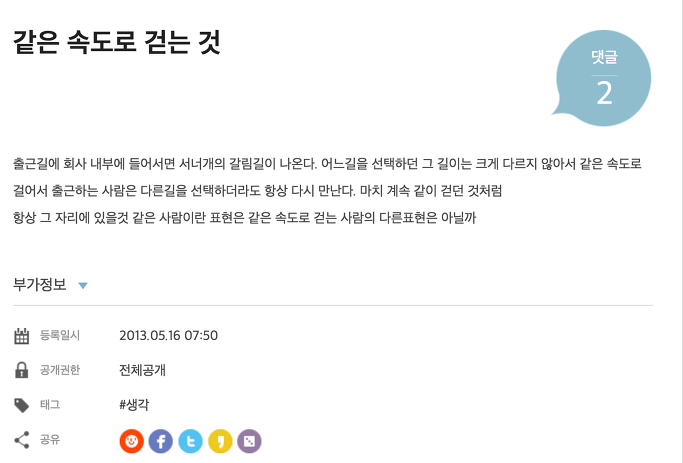 최근에는 페이스북이나 싸이월드 (난 상대적으로 일찍 그만둔 사람들과 비교하면 최근? 까지 싸이월드에 글을 올렸었다. 그 유행이 한참 전에 끝났음에도 불구하고) 에 종종 생각을 적어서 올렸던 것 같고.