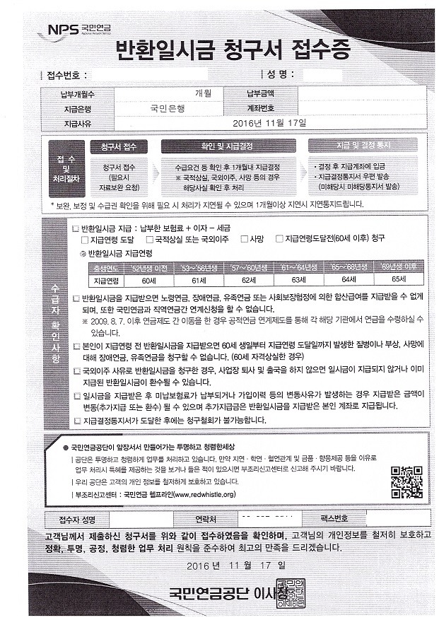 서류 확인 후 아래와 같은 접수증을 줍니다. 접수증에는 그동안 납부 개월수, 납부금액, 계좌번호 등이 적혀 있고 접수자의 이름과 연락처가 있습니다.