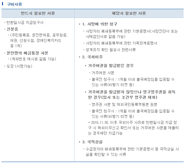위 캡춰된 이미지를 보면 2016년 11월 30일 이후에는 해외이주신고 확인서 또는 거주여권 사본을 제출하는 경우에만 지급이 가능하다고 되어있습니다.
